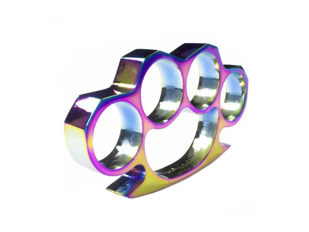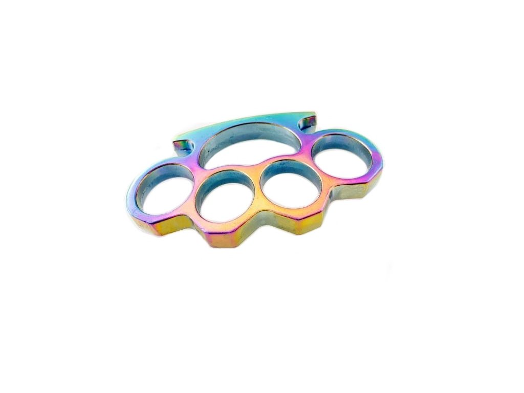 Dizajn obsahuje štyri prstové otvory a výraznú spodnú oporu, čo zabezpečuje pevný a istý úchop aj pri intenzívnom použití — či už v sebaobrane alebo ako súčasť výstroje. Povrchová úprava v dúhových odtieňoch zaručuje, že tento model okamžite upúta pozornosť.