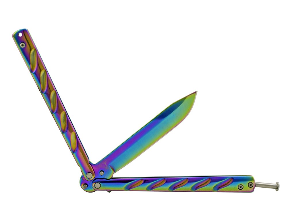 Výrazný motýlikový nôž Benchmade Rainbow Flare s oceľovou čepeľou 9,5 cm, celkovou dĺžkou 22,7 cm, váhou 145 g a farebnou „fade rainbow“ povrchovou úpravou.