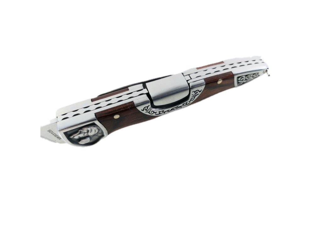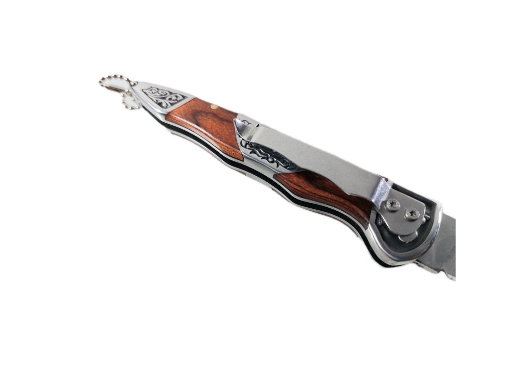 Rukoväť v kombinácii pakkawoodu a kovu zabezpečuje estetiku aj pevný úchop; nôž je vybavený klipom pre jednoduché prichytenie k opasku alebo vrecku. Poistka typu back‑lock zaručuje bezpečné uzamknutie čepele v otvorenom stave. Tento model je výbornou voľbou pre tých, ktorí hľadajú univerzálny a elegantný vreckový nôž s praktickým využitím.