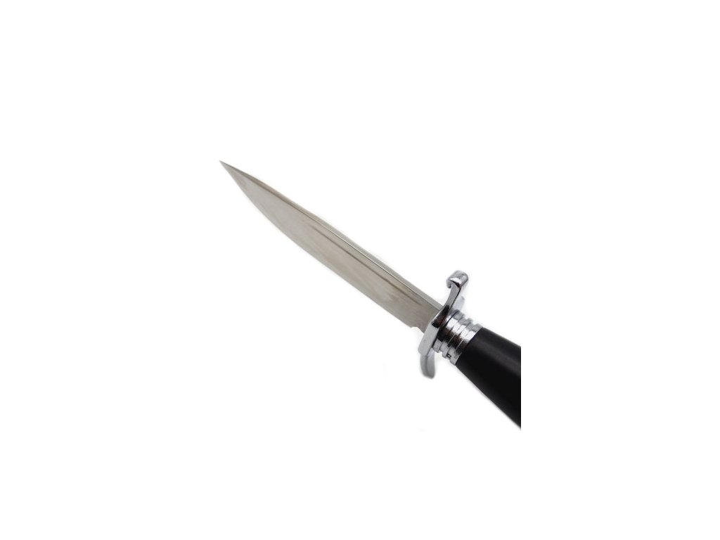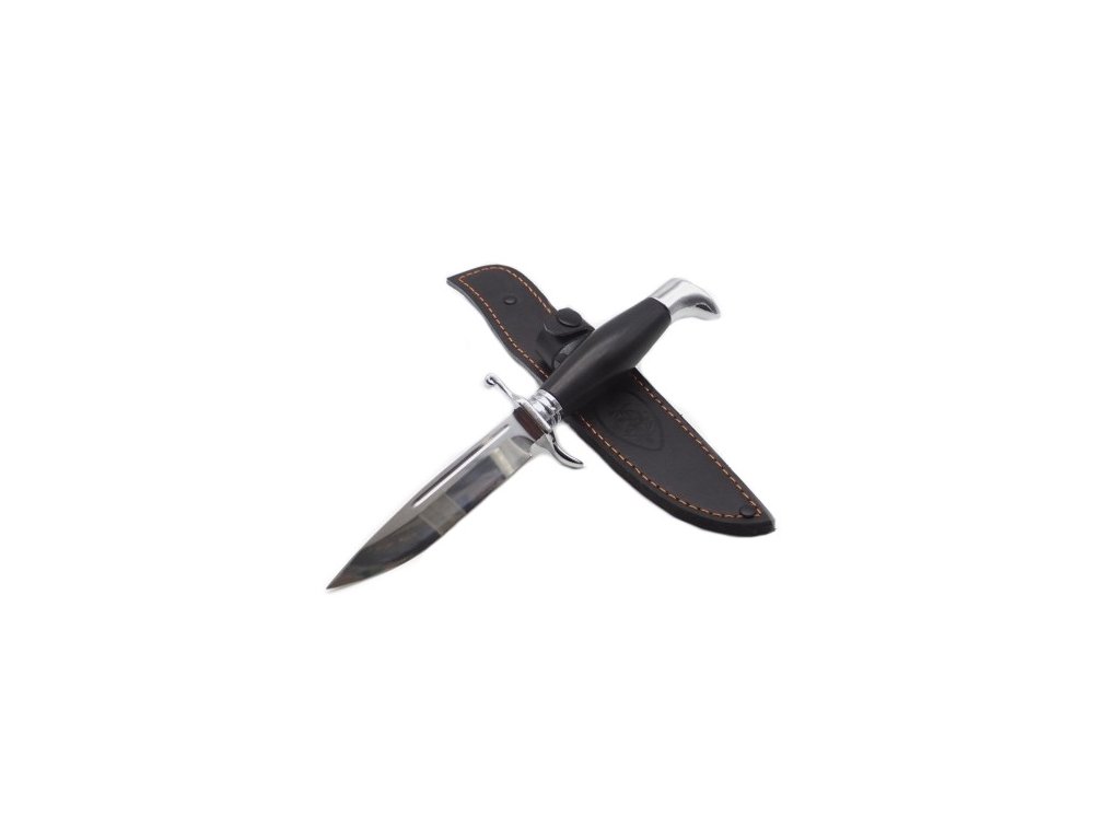 Finka „NKVD KGB“ – ruská dýka s čepeľou 12 cm, drevenou rukoväťou a koženým púzdrom na opasok, celková dĺžka 26 cm.