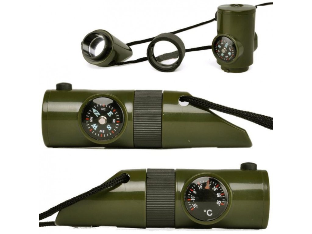 Silný signálny tón pomáha upútať pozornosť v prípade potreby, zatiaľ čo vstavaný kompas uľahčuje orientáciu v teréne. Teplomer ukazuje aktuálne podmienky, zrkadlo slúži na signalizáciu záchranárom a lupa je praktická pri detailnom sledovaní alebo rozpalovaní ohňa v teréne. Súčasťou je aj LED svetlo a šnúrka pre jednoduché nosenie na krku alebo výstroji.