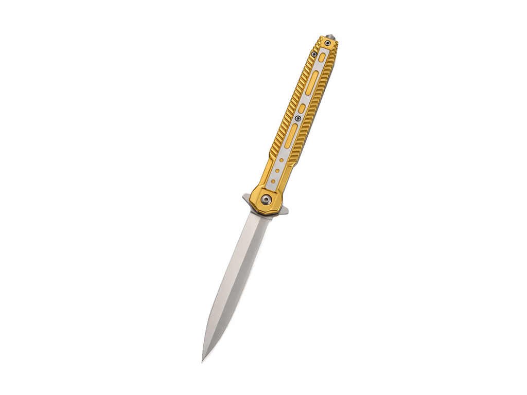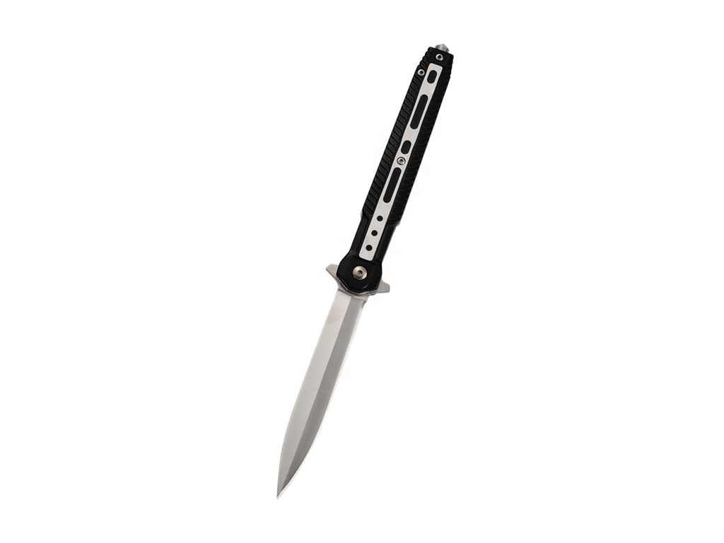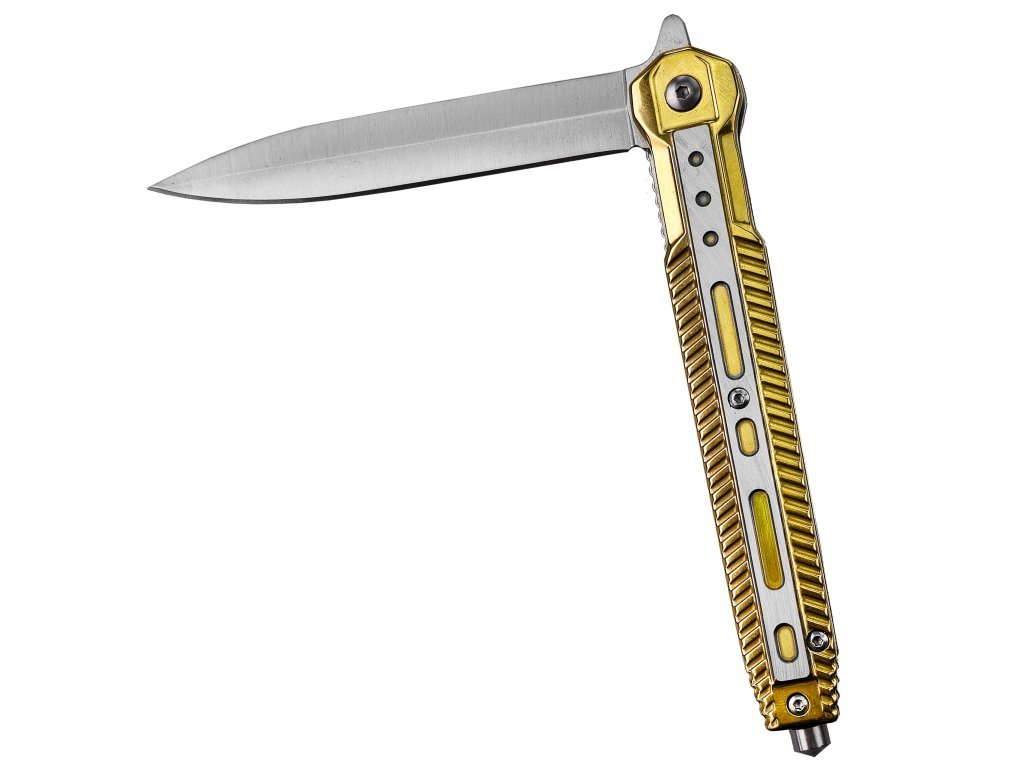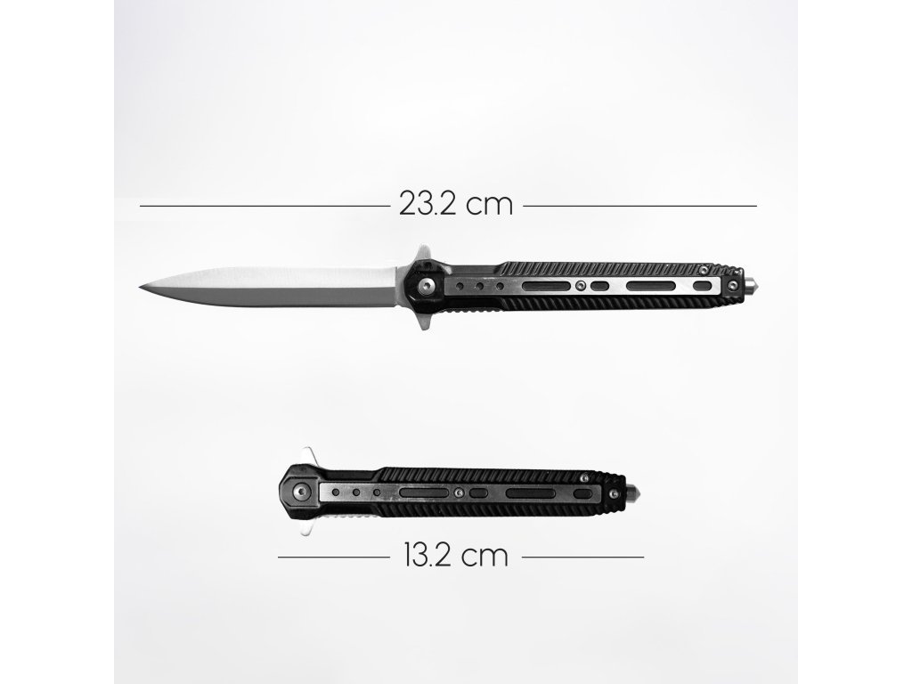 Čepeľ noža má dĺžku 9,5 cm a je vyrobená z ocele 440, ktorá zaručuje dobrú odolnosť a ostrenie. Rukoväť je kovová, s výrazným ryhovaním pre lepší úchop, a je doplnená o hrot na rozbitie okna – užitočná funkcia v núdzových situáciách.