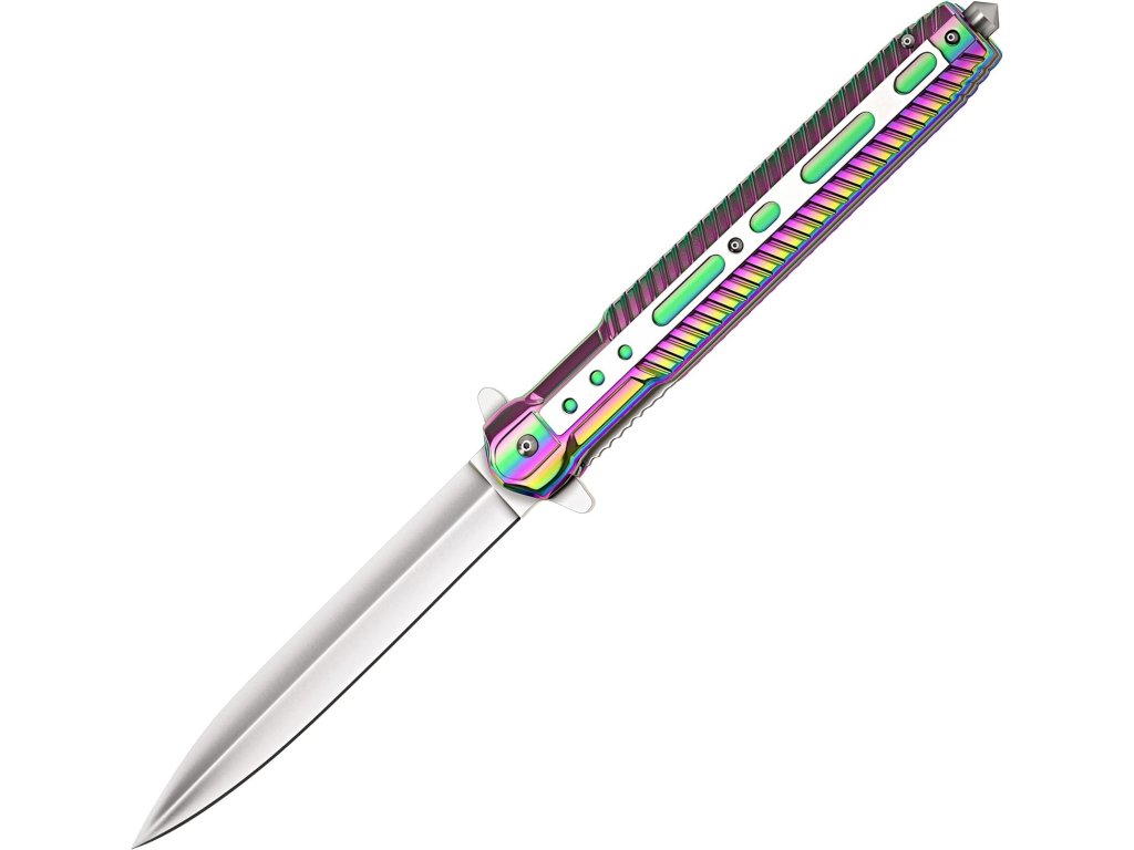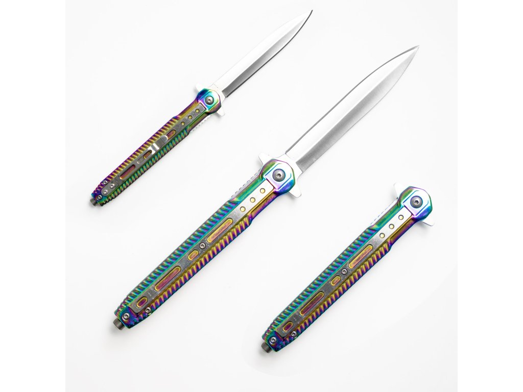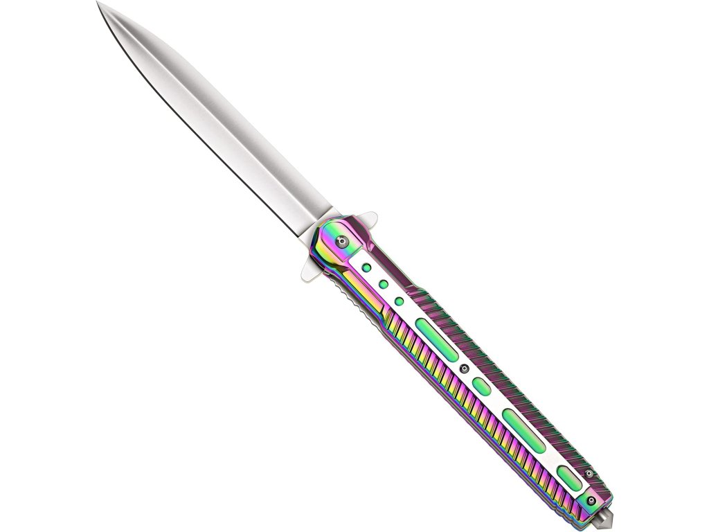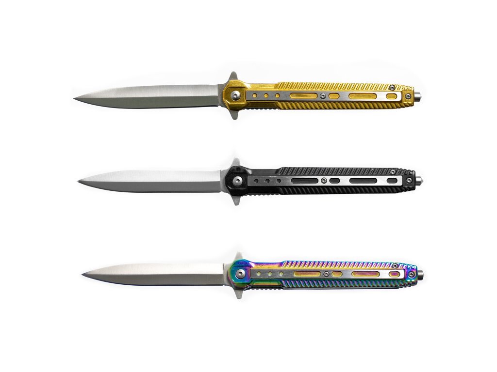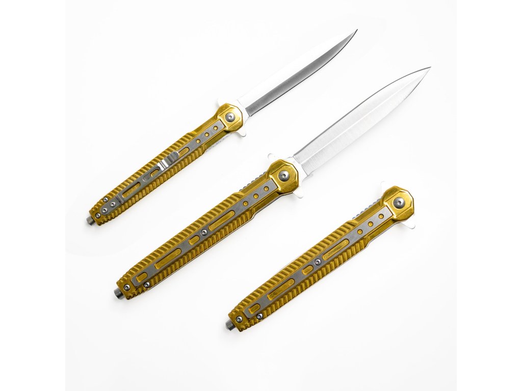 Čepeľ noža má dĺžku 9,5 cm a je vyrobená z ocele 440, ktorá zaručuje dobrú odolnosť a ostrenie. Rukoväť je kovová, s výrazným ryhovaním pre lepší úchop, a je doplnená o hrot na rozbitie okna – užitočná funkcia v núdzových situáciách.