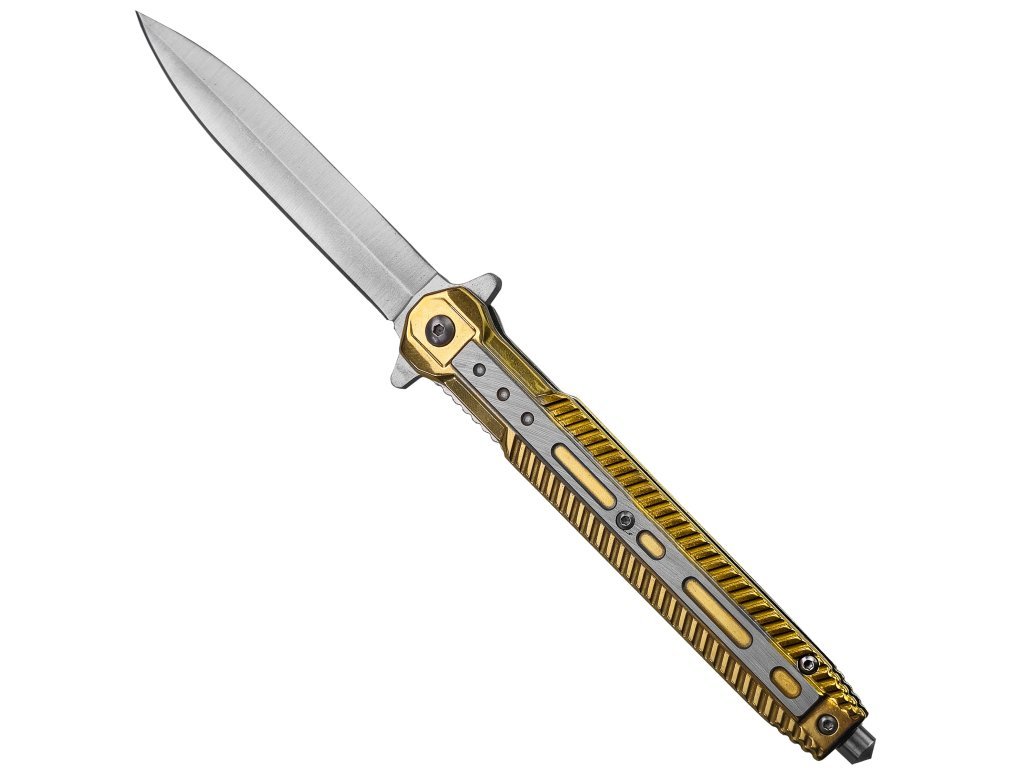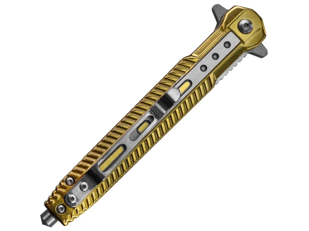 Štíhly vreckový nôž s 9,5 cm čepeľou z ocele 440, kovová ryhovaná rukoväť, Liner‑Lock a hrot na rozbitie skla.