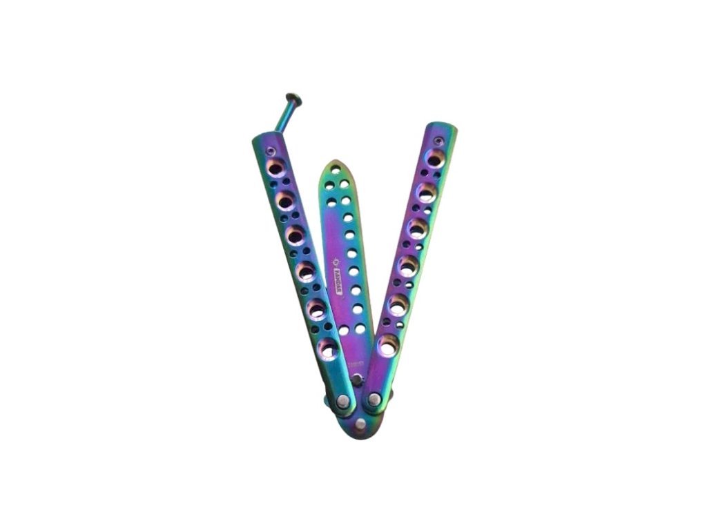 Tréningový motýlik nôž s tupou čepeľou a celokovovou konštrukciou v dúhovom „Fade“ prevedení. Ideálny na nácvik trikov bez rizika porezania.