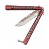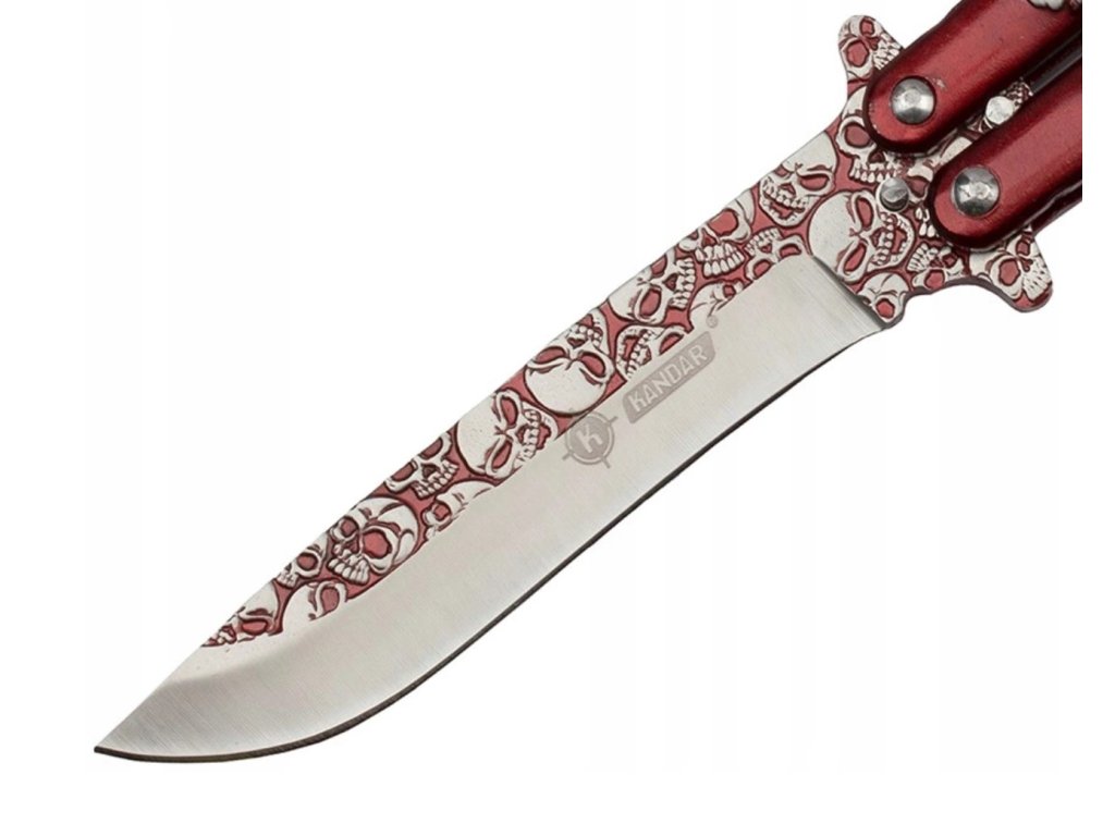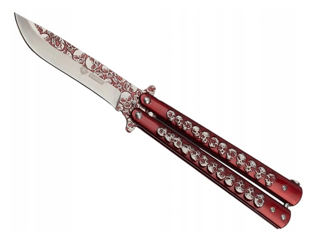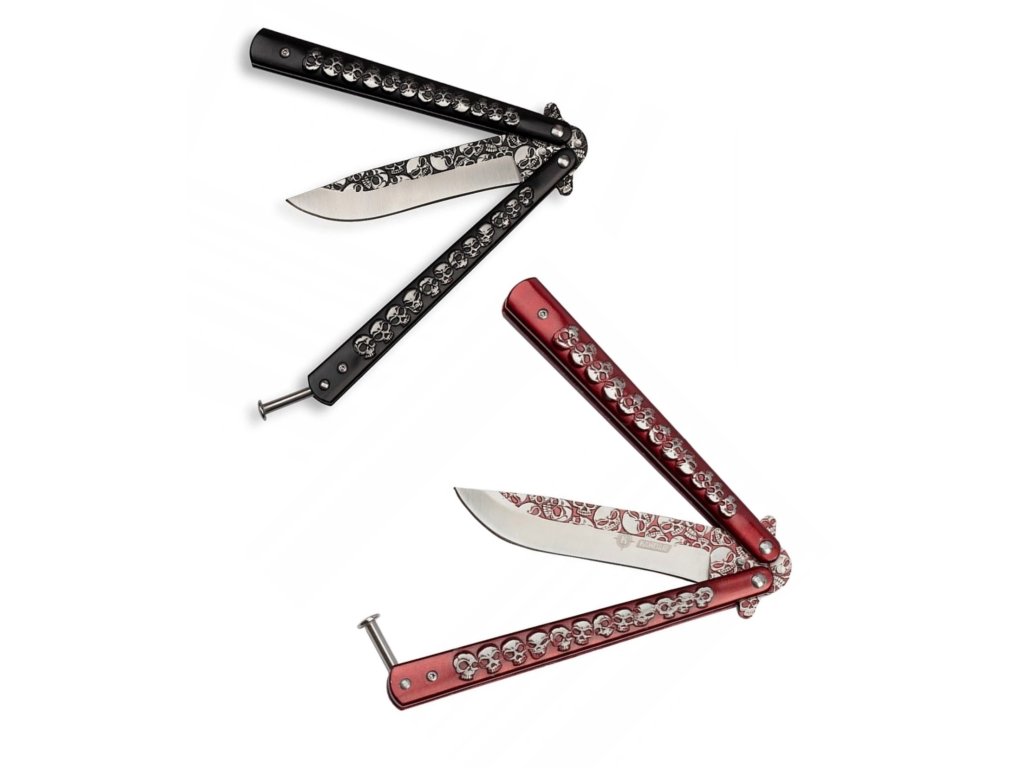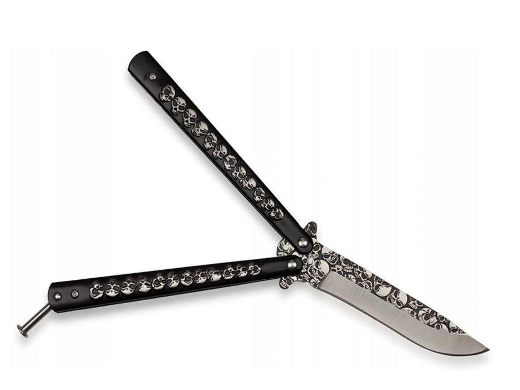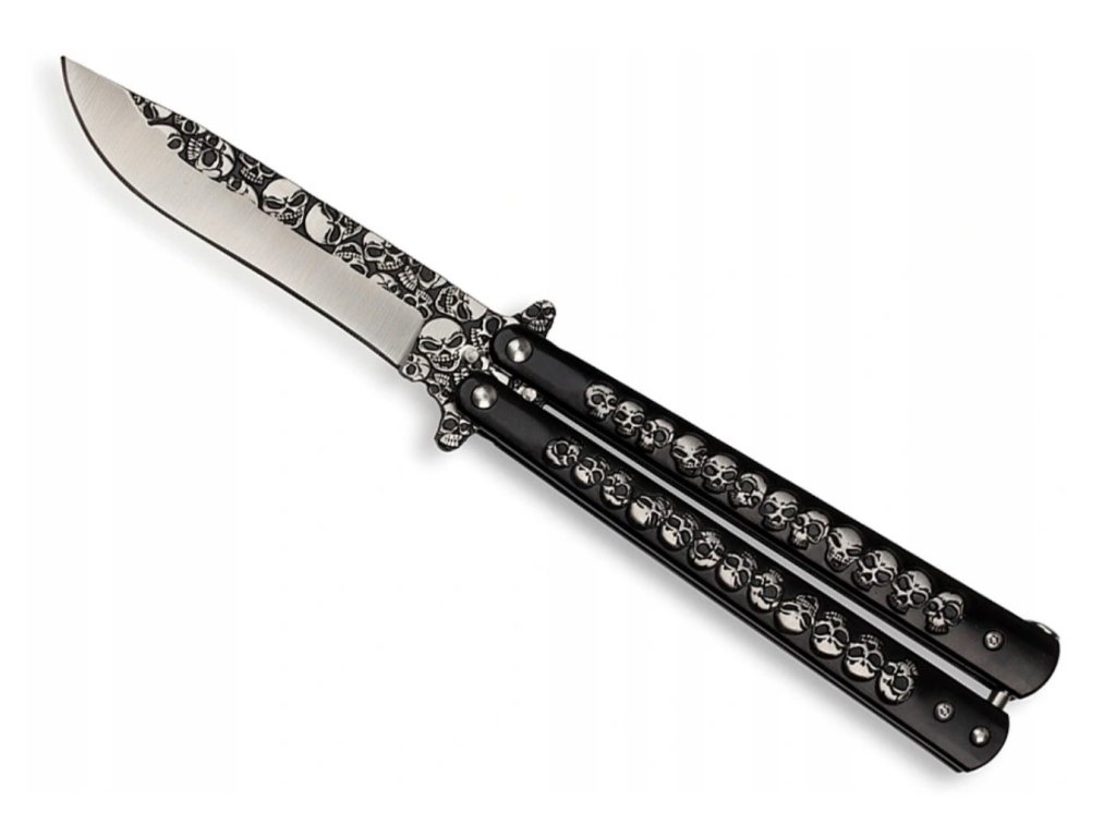Odvážny vreckový motýlik nôž s dizajnom lebiek, dĺžkou čepele 10 cm a rukoväťou z kovu – ideálny pre trikovanie aj zbieranie.