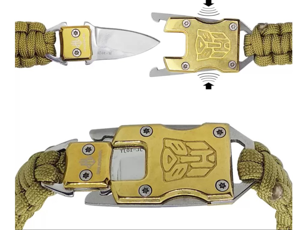 Paracord náramok Survival Emergency Sand Gold je kvalitný náromok na prežetie s pevnou čepelou noža s dĺžkou až 3,2cm. Spona je celá kovová s pružinou. Pevne drží na ruke a dá sa rýchlo odpnúť. Náramky sú upletené z 2-3 metrov paracordovej šnúry 550.