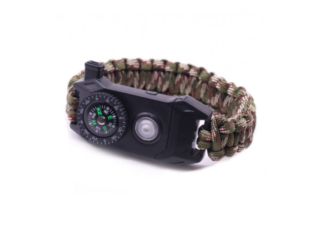Profesionálny Paracord náramok XenoX Ultra X10 Camouflage s kresadlom na založenie ohňa, s kompasom, píšťalkou, svetlom a malou čepieľkou noža. Spona je z ABS. Náramky sú upletené z 2-3 metrov paracordovej šnúry 550.