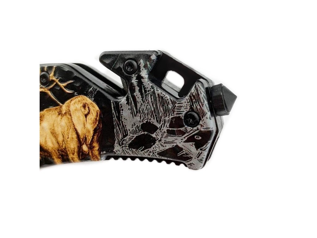 Taktický vreckový nôž Deer Black and Yellow B110 je typ noža poloautomatický s krásnym vzorom jeleňa. Nožom dominujú tmavšie farby s estickým vzorom jeleňa v prírode. Pekný kúsok ktorý poteší nadšencov prírody a je vybavený taktiež veľkým uderníkom na rozbitie skla a taktiež čepelou na odrezanie pásov alebo povrazov bez nutnosti použitia hlavnej čepele noža. Čepel noža je zo 440 ocele v čierno žltej farbe. Čepel je potiahnutá odolný náterom. Rukoväť je kovová a obklopuje ju tvrdený ABS plast so vzorom jeleňa. Klasická poistka pod čepelou.
