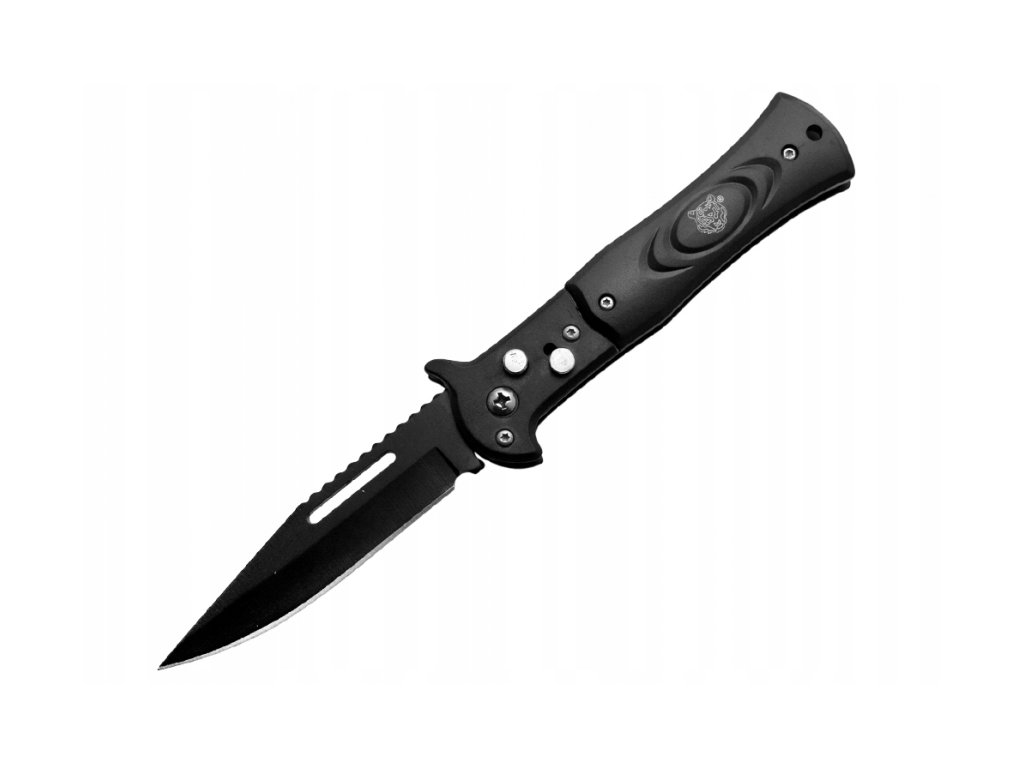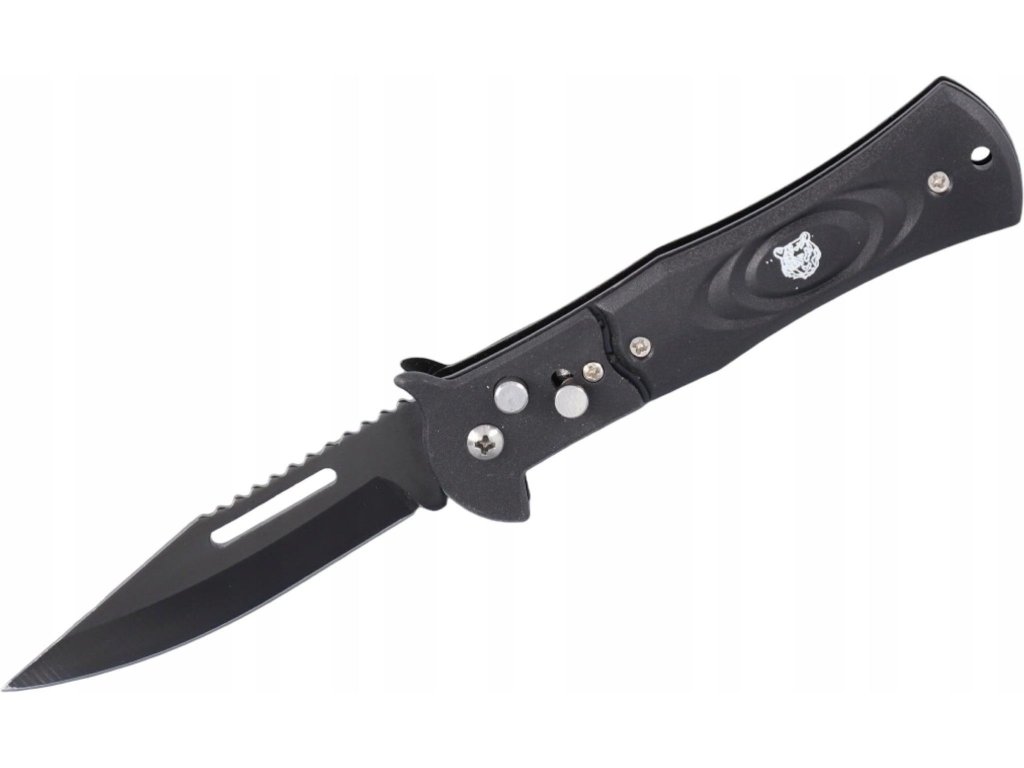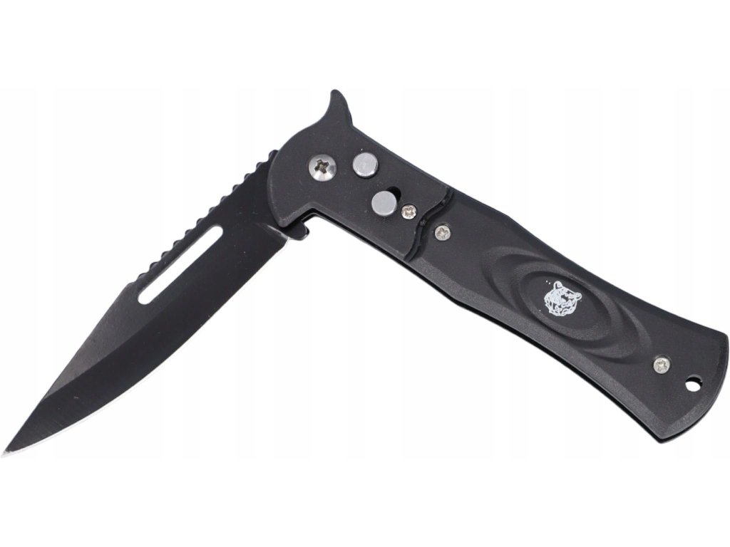 Ultralahký automatický nôž TIGER v taktickom čiernom dizajne s bleskovým otváraním a posuvnou poistkou – ideálny pre rýchlu manipuláciu a nenápadné nosenie.