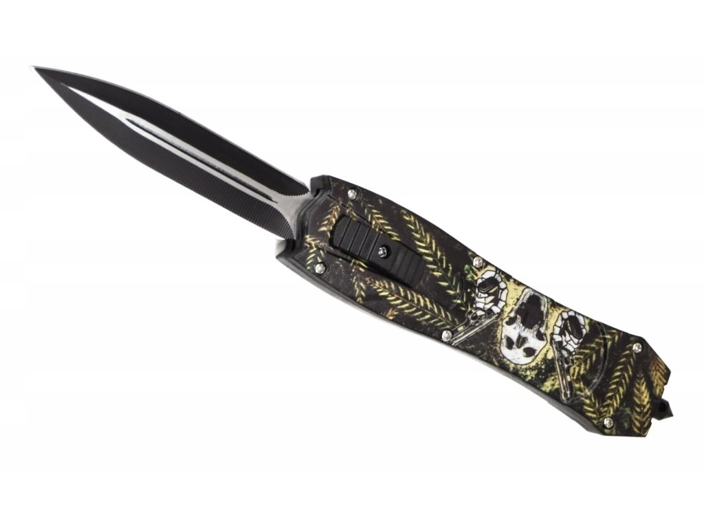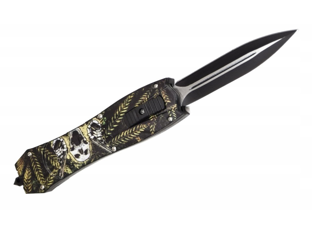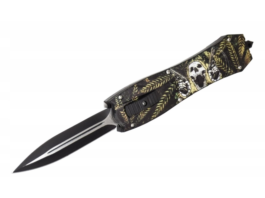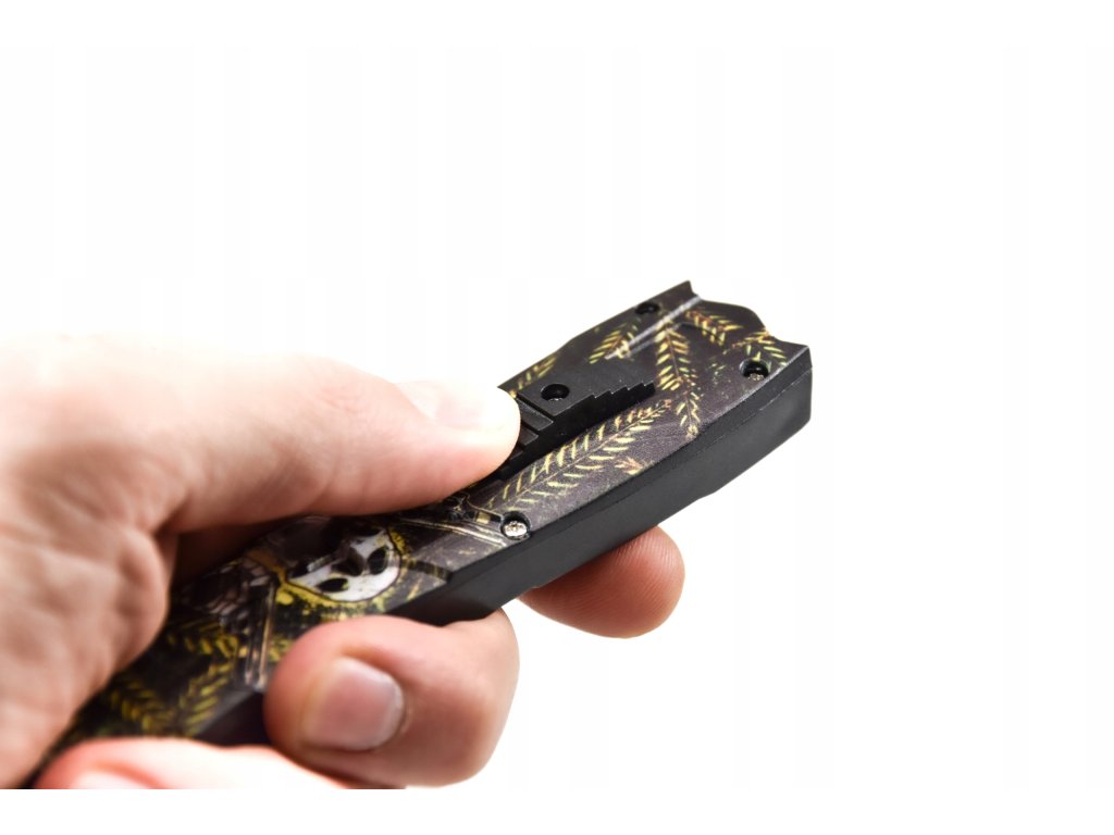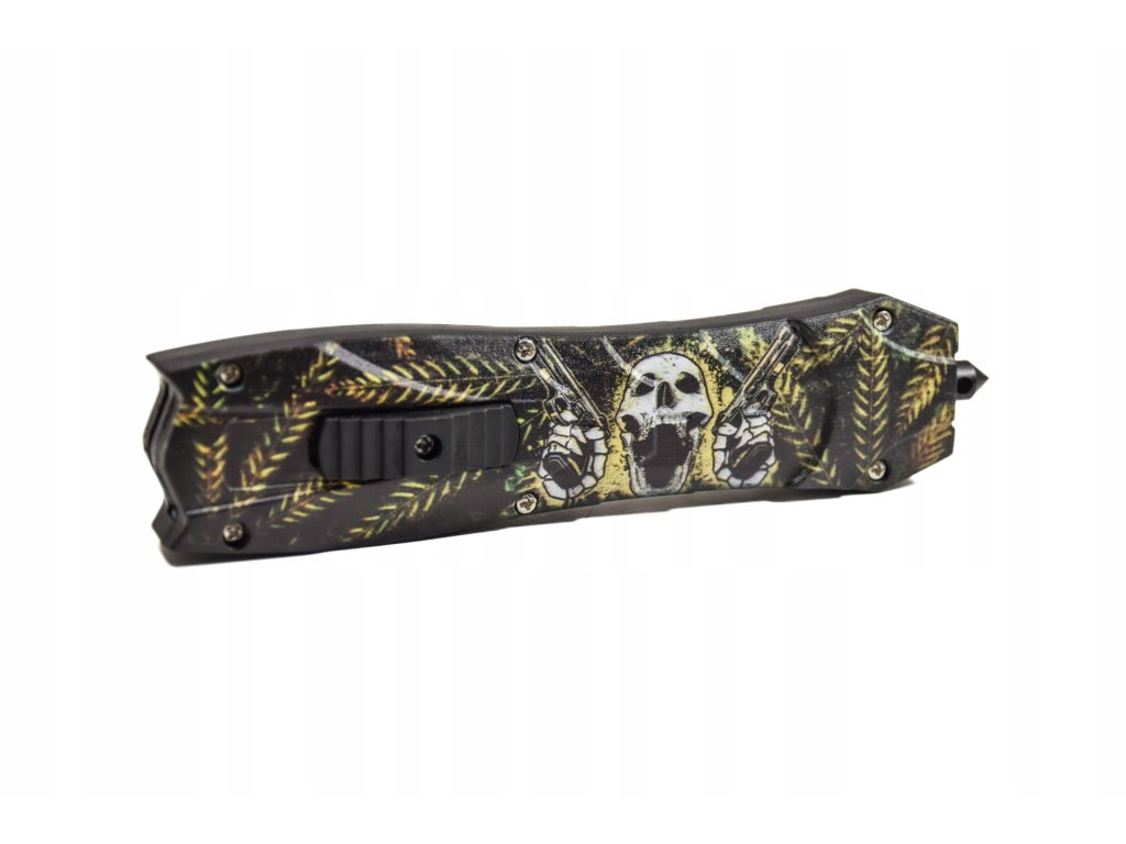 Dizajn noža je obzvláštnený unikátnym vzorom lebky s pištolami a trávou, ktorý mu dodáva jedinečný a drsný vzhľad. Vystreľovací nôž ABS+ Skull Marihuana je ideálny spoločník do prírody, na turistiku či na každodenné použitie.